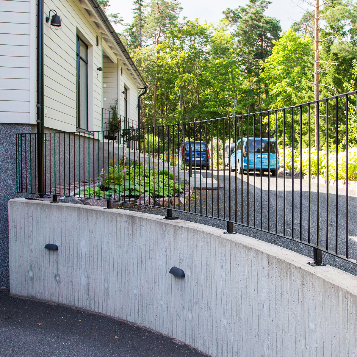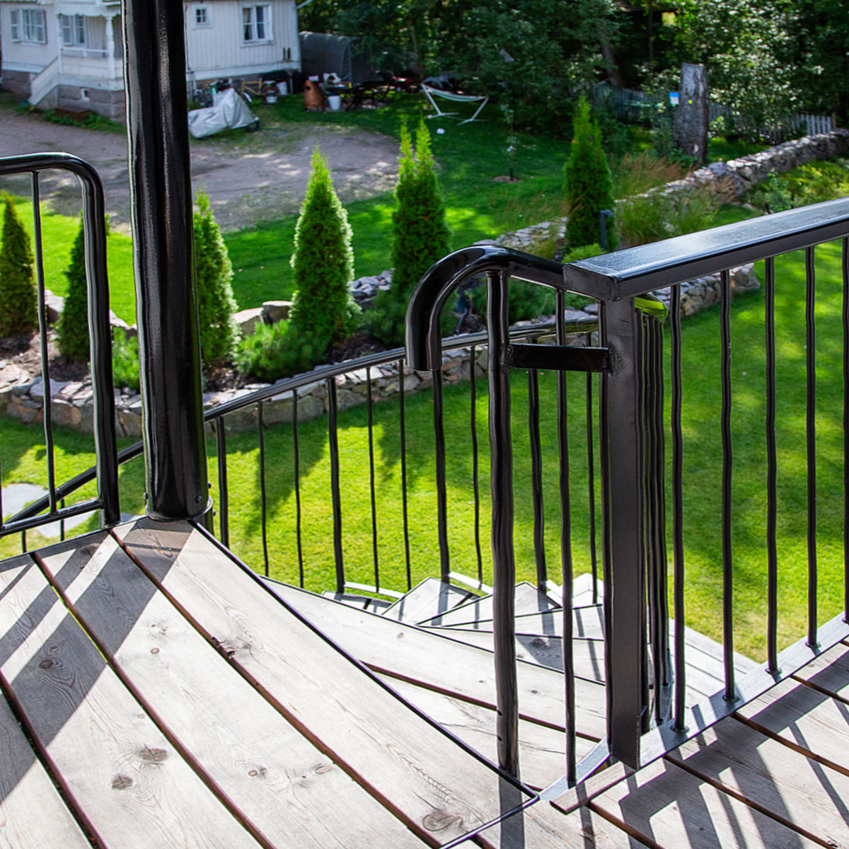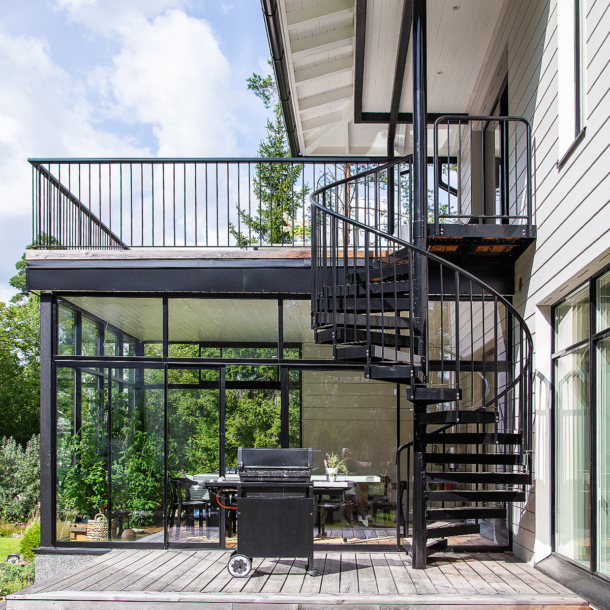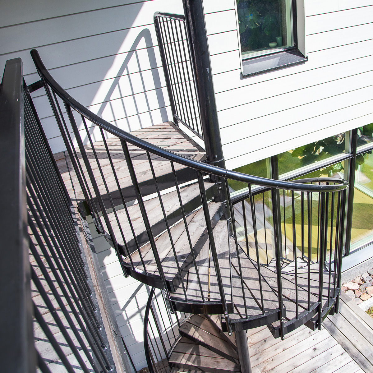 Ulos toteutettiin kierreporras terassilautaupotuksella, muurikaide sekä kymmeniä metrejä parvekekaidetta.