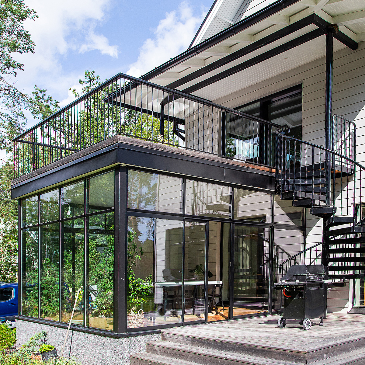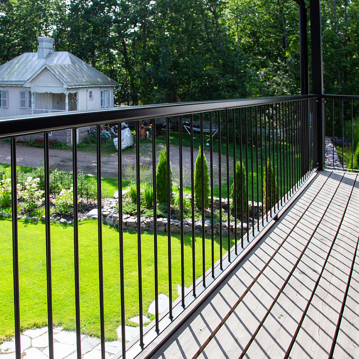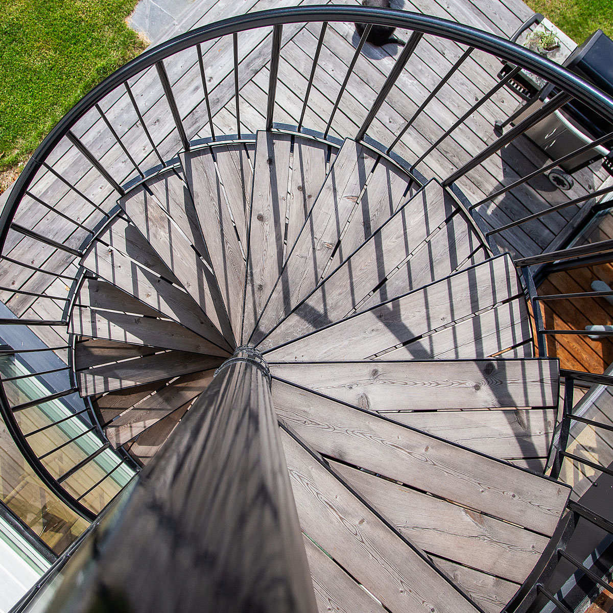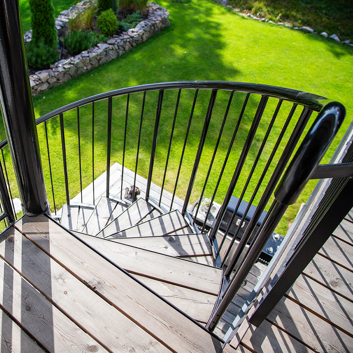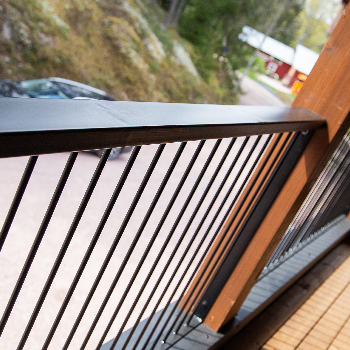 Ulos toteutettiin kierreporras terassilautaupotuksella, muurikaide sekä kymmeniä metrejä parvekekaidetta.
