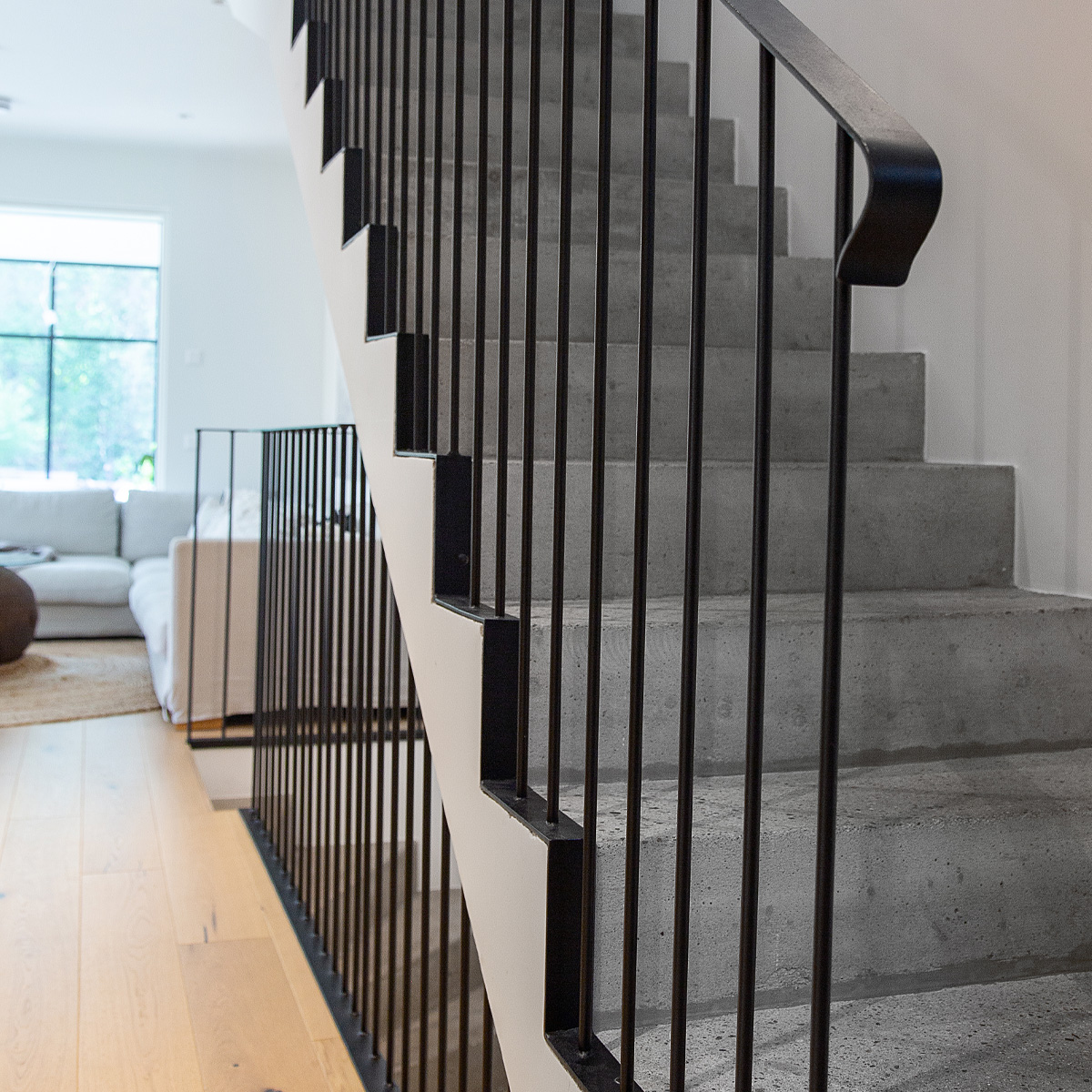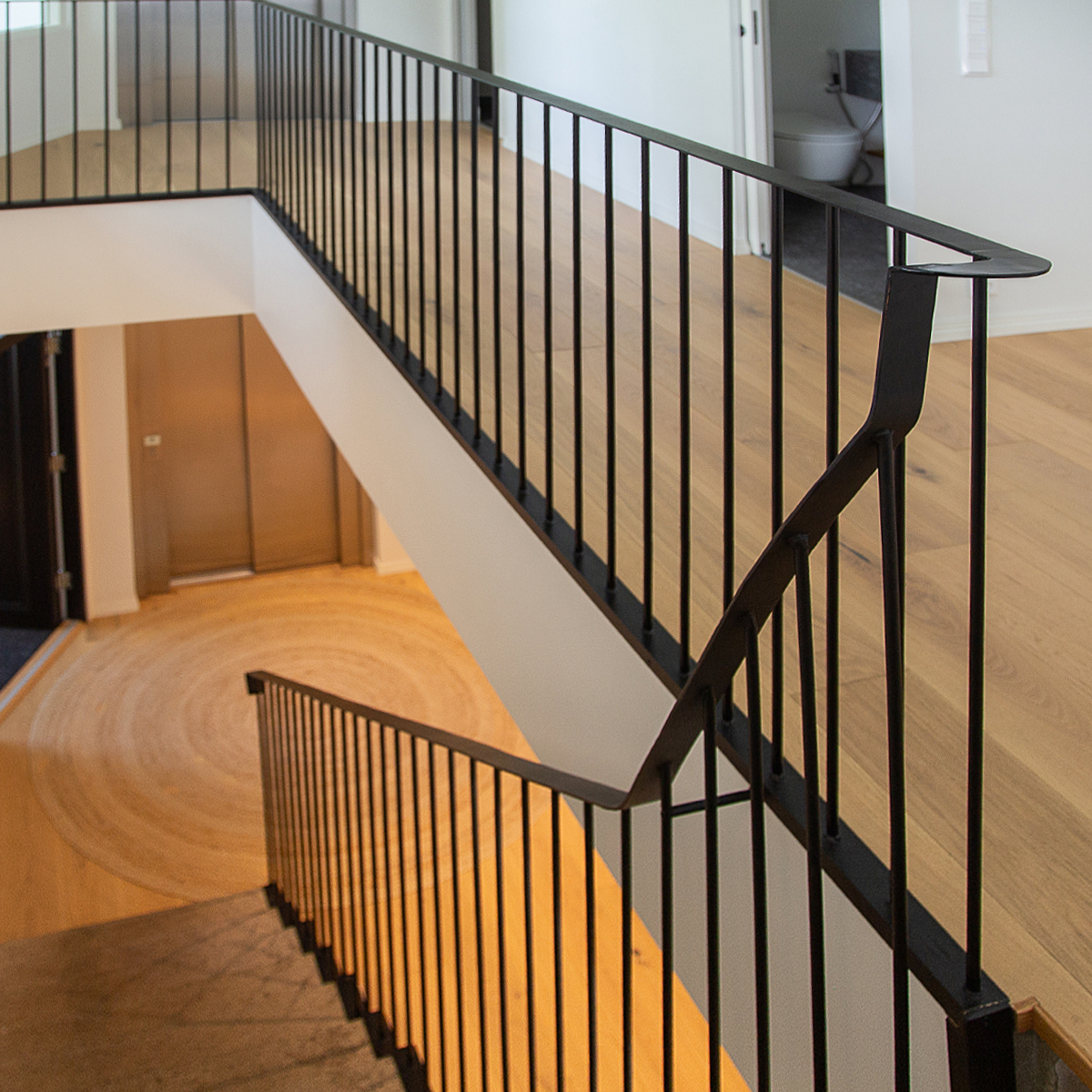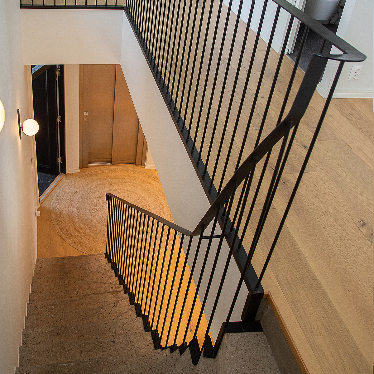 Sisätilojen betoniportaaseen räätälöitiin asiakkaan toiveita kuunnellen hieno hitsattu pinnakaide, joka kulkee askelmien mukaisesti. Sisälle toteutettiin myös muita hitsattuja pinnakaiteita sekä käsijohde alakertaan johtavaan portaikkoon.