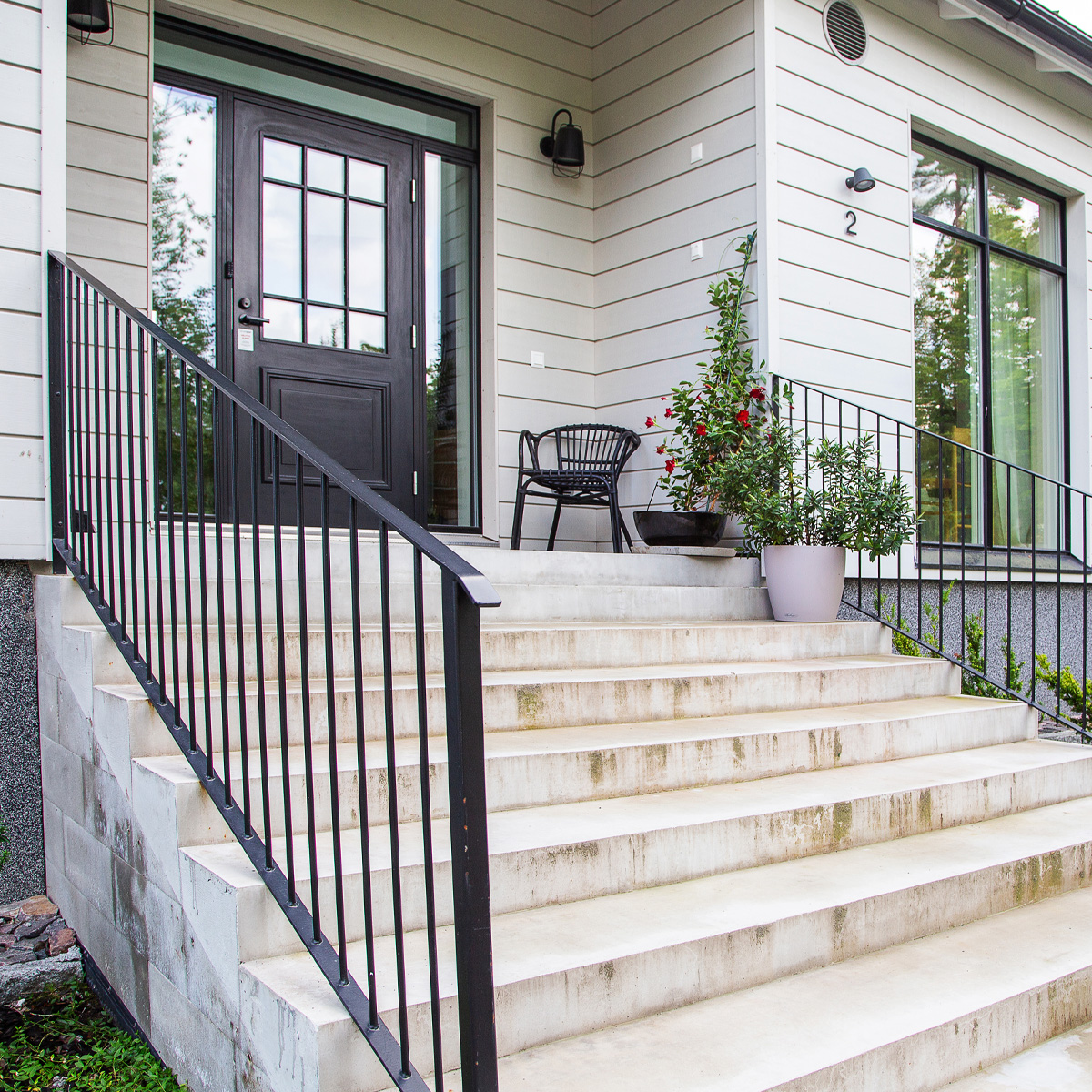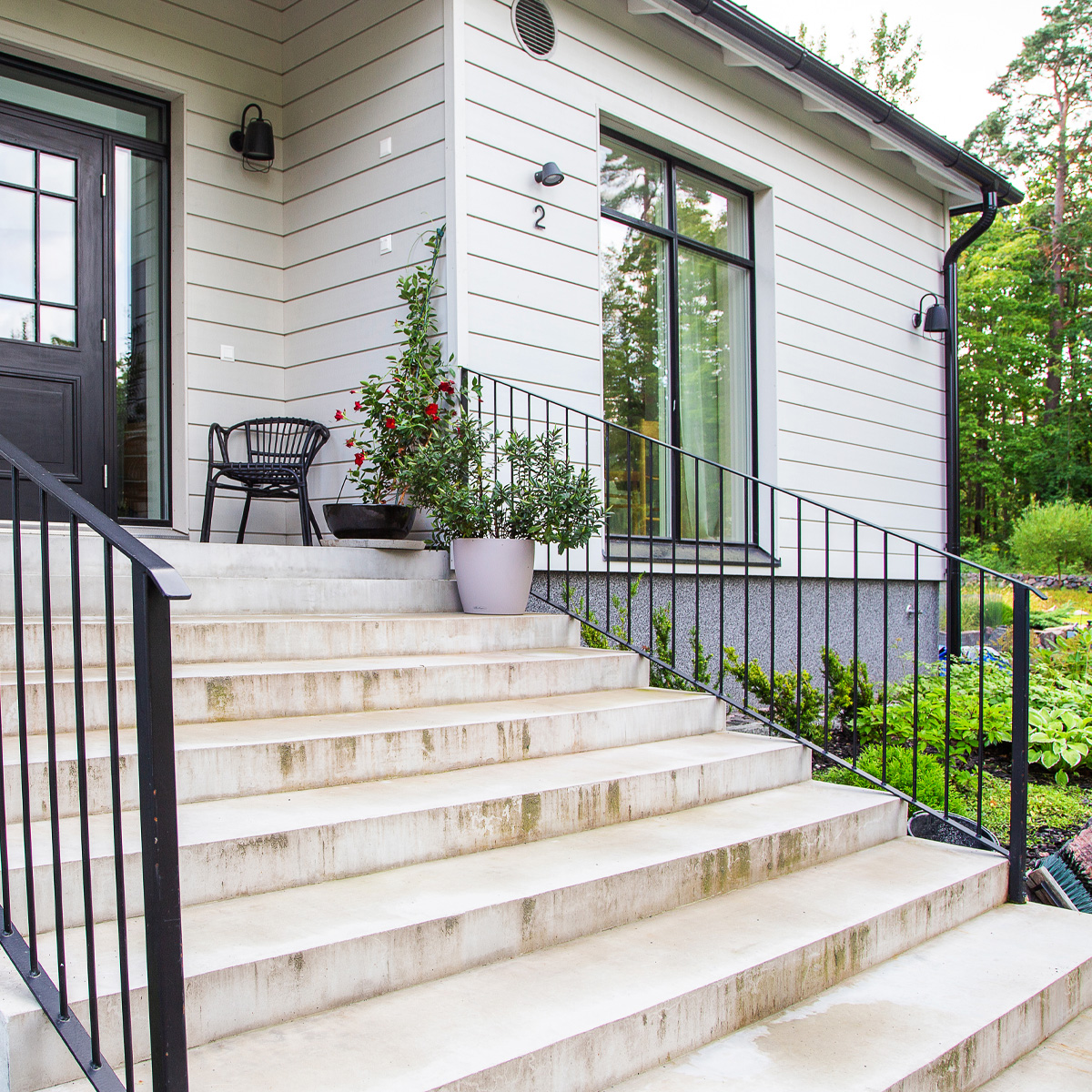 Asiakkaan toiveiden pohjalta suunnittelimme monenlaisia toteutuksia tähän kohteeseen. Kauniiseen paritaloon rakennettiin tyylikkäitä ja uniikkeja porras- ja kaideratkaisuja.